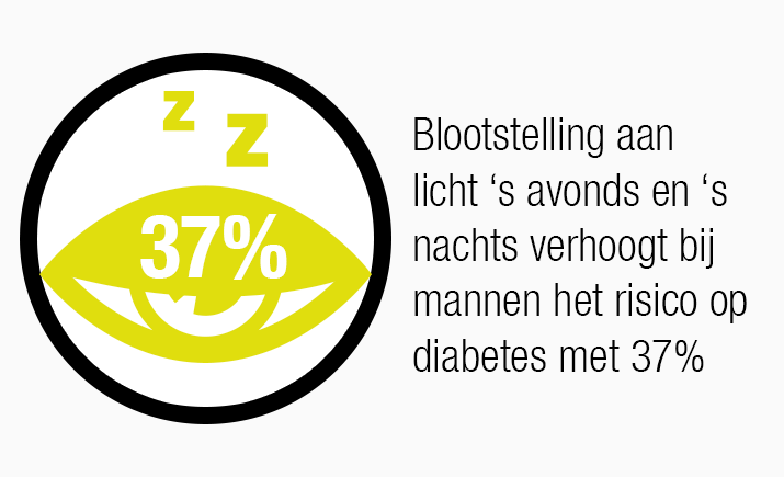 Blootstelling aan licht ‘s avonds en ‘s nachts verhoogt bij mannen het risico op diabetes met 37% volgens ‘Shift work and diabetes mellitus’ door Gan Y et al. van Huazhong University of Science and Technology. Een andere studie over ploegenarbeiders met de nachtshift koppelde de effecten van conventionele ledverlichting 's nachts aan insulineresistentie en het risico op diabetes.